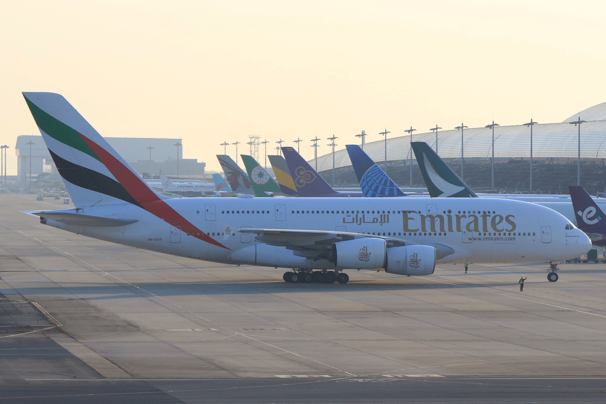 エミレーツ航空316便、ドバイから到着、A380-800(A6-EUT)。